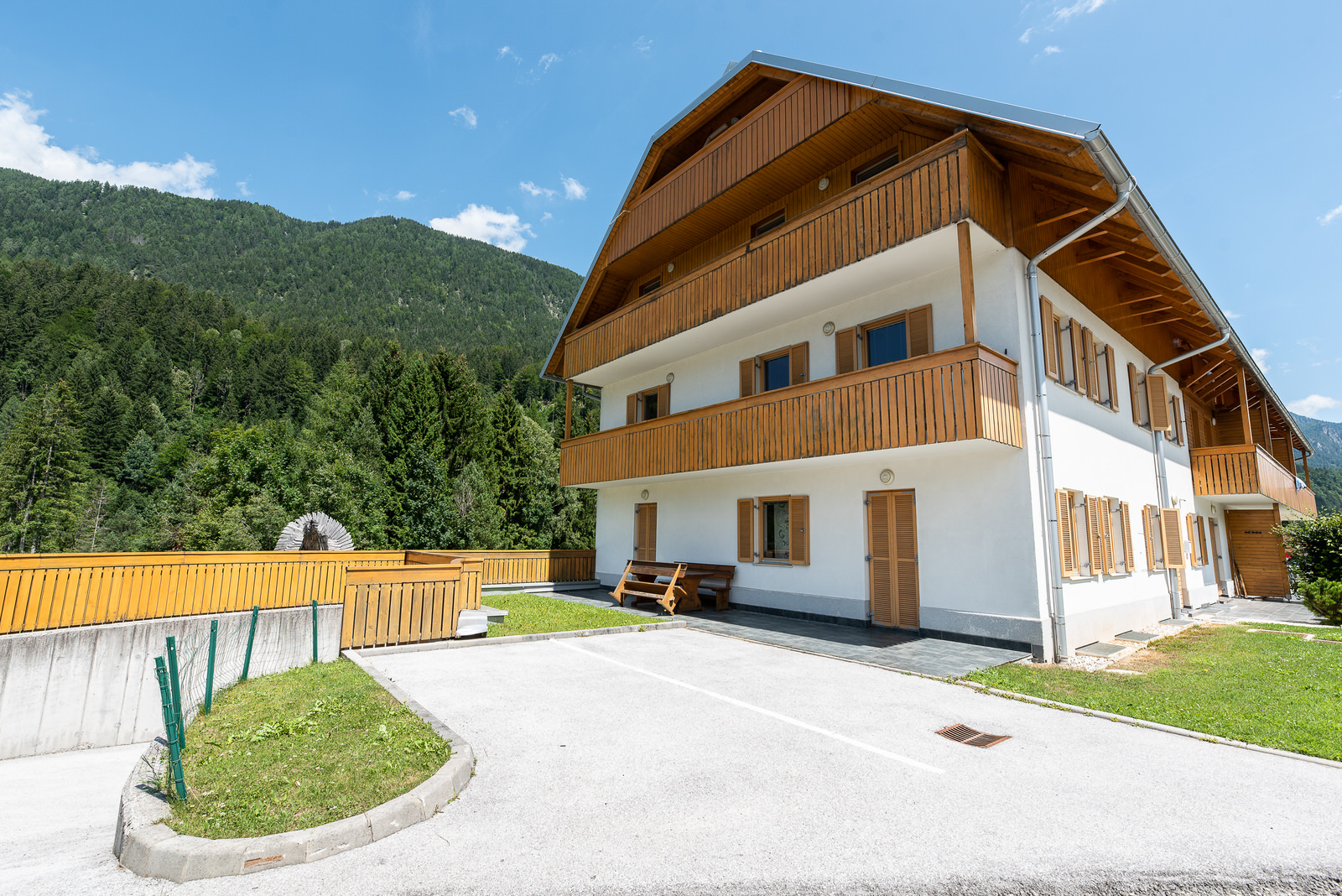 Stavba ima moderno zasnovo s tipično alpsko arhitekturo, ki jo obdajata lesena fasada z balkoni. Moderna je tudi notranjost, ki nudi gostu počutje in udobje v vsakem kotičku svojega drugega doma. Nahaja se tik ob vstopu v Kranjsko Goro, v neposredni bližini kolesarske steze, ki vodi v središče Kranjske Gore, naprej v Podkoren in Italijo. Smučišče je oddaljeno dobre 3 km z avtom, do tja pa vozi tudi smučarski avtobus. Lokacija je zanimiva v vseh letnih časih, saj je v okolici ogromno možnosti za zimski in letni turizem, različne izlete, tako zimske kot letne športe, prireditve in oddih.