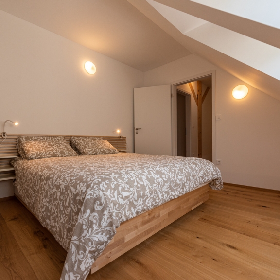 Apartma obsega dnevni prostor, kuhinjo, dve ločeni sobi in kopalnico. 88m2 bivalnega prostora (skupaj z balkonom) omogoča udobno bivanje 4-6 gostov (raztegljivo ležišče tudi v dnevnem prostoru). V sklopu apartmaja je tudi eno parkirno mesto, velika klet in kolesarnica.