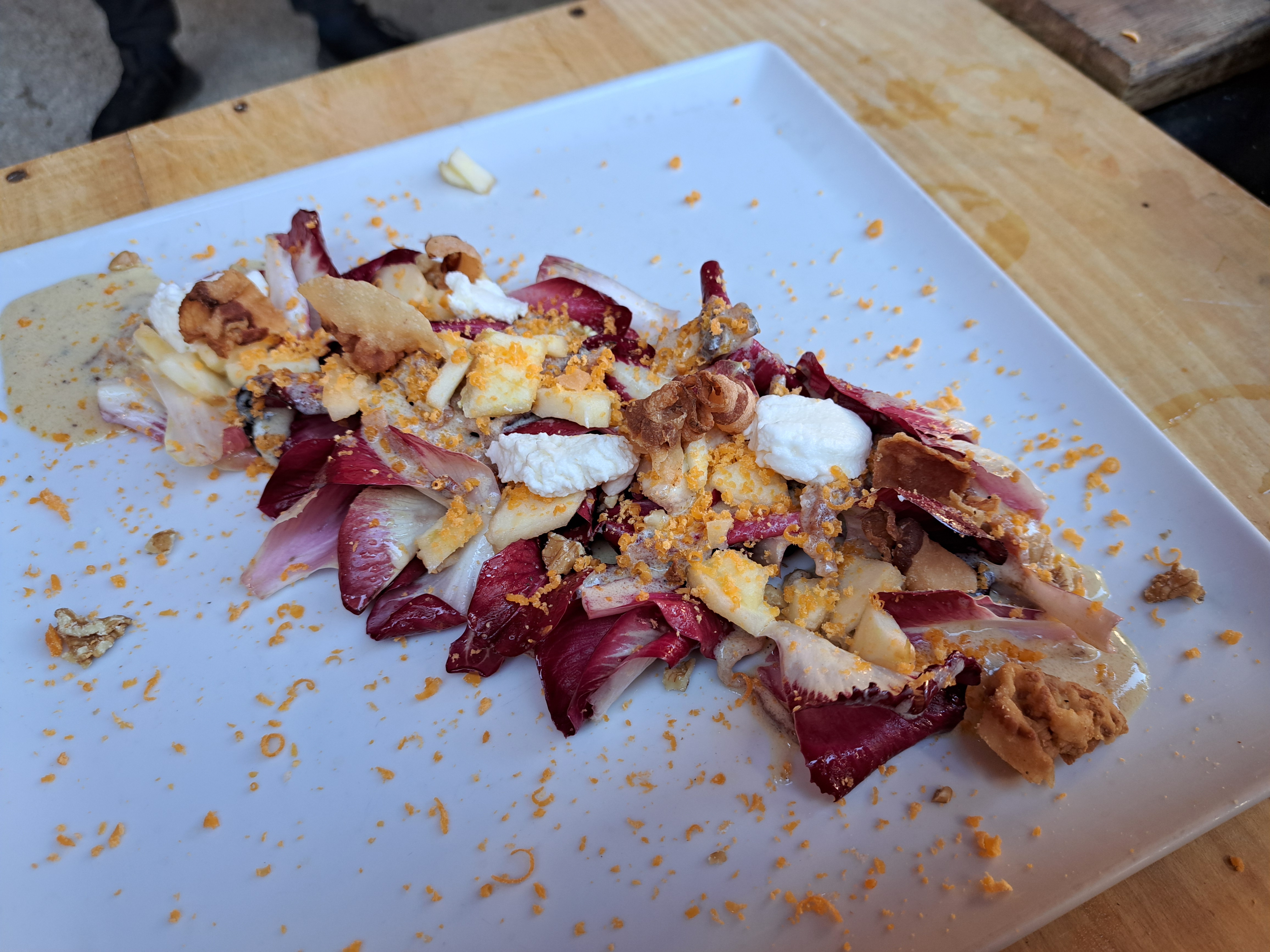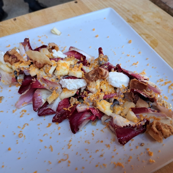 Vzdušje se je vedno bolj sproščalo, tudi na račun žlahtne kapljice, ki nas je spremljala vse do Ošterije Žogica, kjer je potekalo tekmovanje v pripravi solate iz »sukenskega reguta«, kisa in ocvirkov. V bitki so se pomerili Ošterija Žogica, Ošterija Branik, Trattoria alla Luna in Gostilna Štirna, med katerimi je naziv zmagovalca bila deležna prav ekipa Ošterije Žogica. Odličen dogodek in super priložnost za promocijo avtohtonega in unikatnega radiča. Dogodek je nedvomno uspel in dosegel svoj cilj, saj so že takoj zvečer o njem govorili na vseh pomembnejših televizijskih postajah. Poklon goriškemu regutu in vsem, ki skrbijo za to, da se njegova zgodba piše že 150 let!