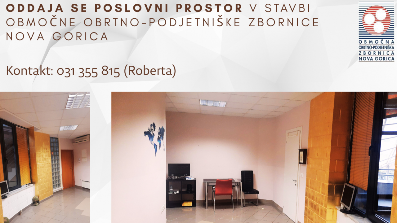 Oddamo v najem pisarno v 1. nadstropju obrtnega doma – 15 m2, ogrevana in klimatizirana, primerna za mirno pisarniško dejavnost.